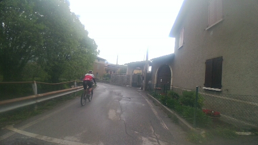Si riparte, le strade sono bagnate, la pioggia minacciosa che vedevamo da lontano è, fortunatamente, già passata di qui. Iniziamo a salire, dolcemente, lungo la “strada del bosco” che conduce a Cagnatico di Odolo. Lì ci attende la temibile cementata di Monte Ere, da me già affrontata durante la Jeroboam di settembre. La descrivo dettagliatamente ad Alex, d’altra parte la si fa a velocità così ridotta che c’è il tempo per memorizzare tutte le curve. In totale sono quasi 3,5km con pendenza media di 9,5%, ma nei primi 2,5km si sta quasi sempre tra 15% e 18%.