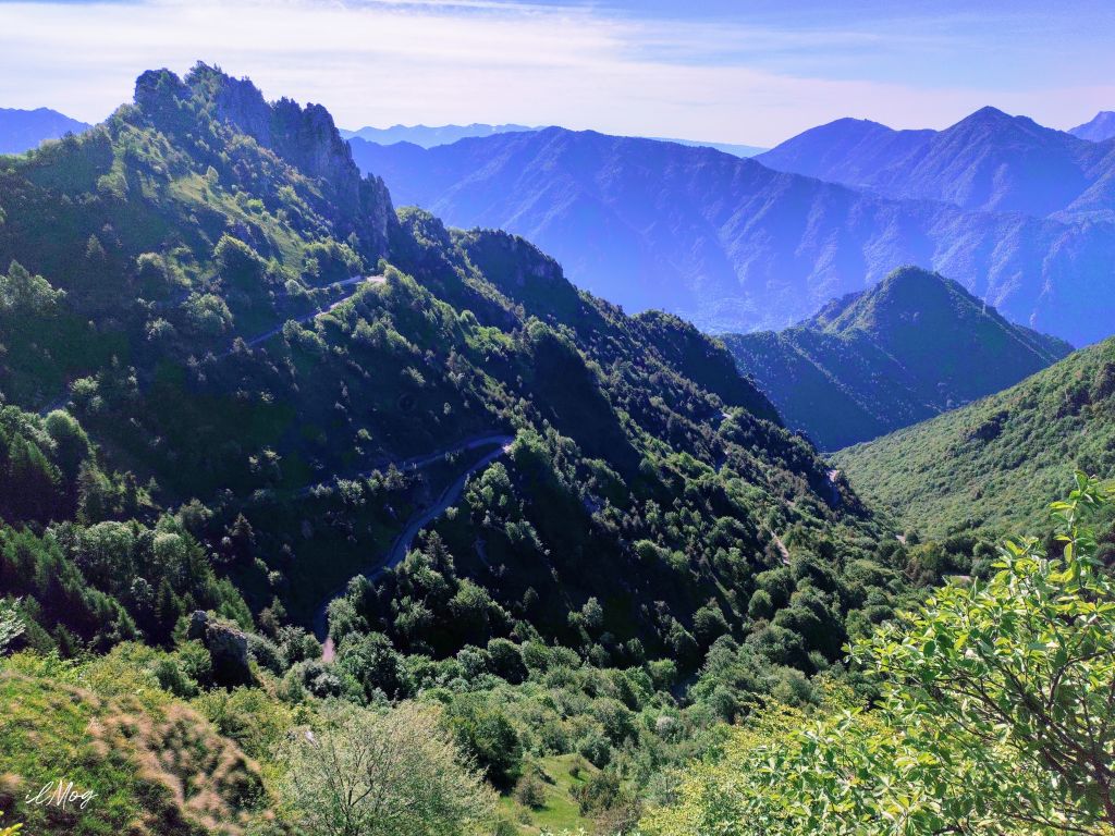 Mi dirigo con passo costante verso le Coste che valico prima delle 6.30, scavalco anche quel piccolo dosso di Preseglie e risalgo tutta la val Sabbia. A quest’ora il traffico veicolare è ancora abbastanza dormiente. Prima delle 7.30 sono sul lago d’Idro, alle 7.45 ad Anfo svolto a sinistra ed inizio la prima vera e grande salita di giornata: il passo Baremone. Ho già riempito una borraccia e mangiato un paio di barrette. La lunga cavalcata in bicicletta di oggi necessita di un apporto costante di carboidrati. Il cielo è terso, il primo rettilineo di salita consente un ampia visuale sull’Eridio e io me lo godo tutto mentre risalgo la montagna. Il Baremone è una delle salite che preferisco, 11km di inequivocabile intensità muscolare (11,2km 980m dislivello pendenza media 9%), ma di inegualiabile bellezza nei panorami. I suoi tornanti sinuosi consentono di ammirare la strada che si è già percorsa snodarsi sotto di sé. È sempre un’incredibile emozione, oggi è anche supportata da un meteo stratosferico ed un clima ancora fresco (17°C/23°C). Intorno alle 9.15 sono in vista del passo ed entro al rifugio per due coche, una la bevo subito e l’altra la verso in borraccia. Cinque minuti di sosta e riparto, la giornata sarà lunga e dovrò ottimizzare anche le soste. So già che l’impulso fotografico mi farà fermare innumerevoli volte con un cielo così limpido ed una profondità di campo così lunga.