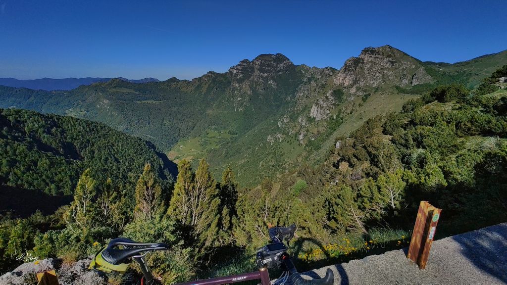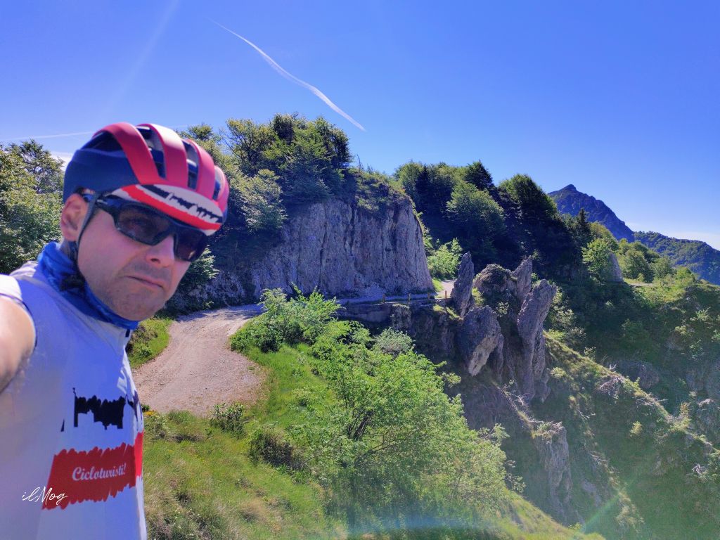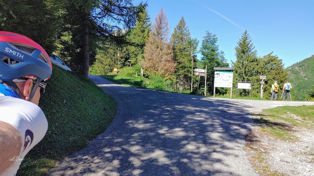 All’uscita mi pervade una enorme tristezza, ero solito condividere le fotografie dei luoghi d’arte con lei. Riparto, la salita a San Zeno attraverso la Val Palot è lunga, sono circa 17km con 1.200m di dislivello con un lungo falsopiano proprio in Palot. Le pendenze, quindi, non sono per nulla costanti e si alternano duri tratti al 12/14% con altri molto più morbidi al 6/8%. Con più di 130km e quasi 2.500m di dislivello nelle gambe l’unica tattica che posso usare per salire è quella della “lentezza”. Questo mi consente di osservare il paesaggio, la natura rigogliosa che mi circonda. In Palot è d’obbligo la fermata alla fontana per mangiare qualcosa e riempire nuovamente le borracce, la temperatura nel fondo valle aveva toccato i 35° e solo dopo l’ingresso nei boschi era ridiscesa sotto i 30°. Ora ci sono 26°C e mi restano i quasi 5km finali per arrivare al colle. In questo caso la pendenza è piuttosto regolare attorno al 7/9%, mantengo un passo lento e in poco più di mezz’ora sono al passo (meglio di quanto pensassi).
