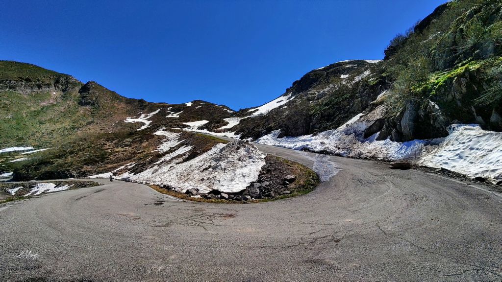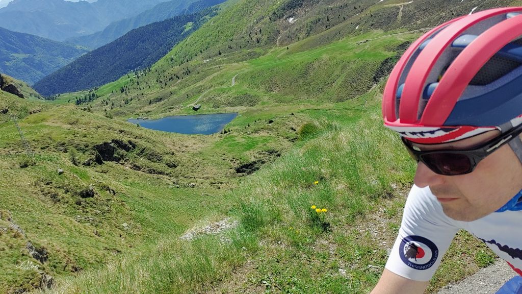 Oggi la giornata è così limpida che da sopra il Bonardi si può facilmente vedere la parte bassa del lago di Garda e distinguere la sinuosa lingua della penisola di Sirmione. Sfortunatamente il mio telefono fa delle buone fotografie, ma non arriva a tanto come teleobiettivo. Arrivare al Dosso dei Galli è sempre una grande emozione, sia per l’impegno fiisco, sia per l’enorme fascino che esercitano i due paraboloidi giganteschi dell’ex-base NATO. Da qui inizia un altro tratto di sterrato, molto più lungo dei due precedenti e intervallato da un paio di tornanti asfaltati. Il fondo stradale è buono, molto più compatto dei precedenti, il paesaggio ora è indescrivibile, di rara bellezza, la profondità di campo sulle Alpi è straordinaria e la neve rimasta a bordo strada aggiunge riflessi luminosi alle intense tonalità di verde e blu di monti e laghetti. Il laghetto di Lavena incastonato tra verdi pascoli e sottili strisce di neve residua lascia storditi dalla magnificenza.