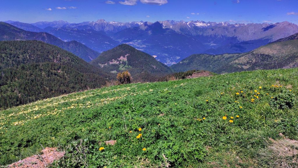 Raggiungo finalmente il passo Crocedomini, è ormai mezzogiorno passato, il rifugio è già stracolmo di avventori, perlopiù motociclisti, come dargli torto vista la giornata. Giusto il tempo di due didascaliche fotografie ed una barretta e mi getto in discesa verso la val Camonica. In realtà ho fame e vorrei fermarmi, ma dopo tutte quelle ore trascorse nel silenzio e nella pace dei monti, le voci sguaiate dei vacanzieri stridono alle mie orecchie. Dopo circa 7km attraverso il piccolo abitato di Campolaro e mi fermo ad un bar con una splendida vista sui monti. Un panino, una coca ed un caffè è il giusto reintegro prima di incanalarmi nella lunga valle. Mezz’ora di sosta rifocillatrice e ricomincio a pedalare.